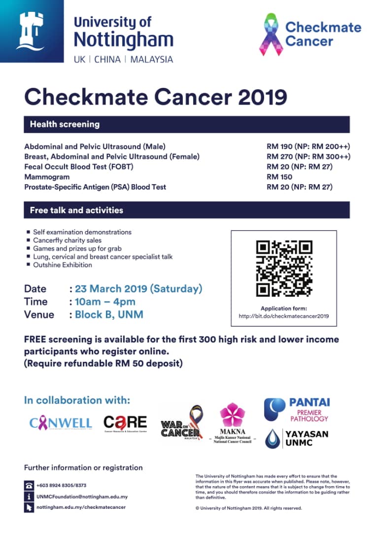 The University of Nottingham Malaysia (UNM) through the Yayasan UNMC is organising our first cancer awareness campaign, Checkmate Cancer 2019.